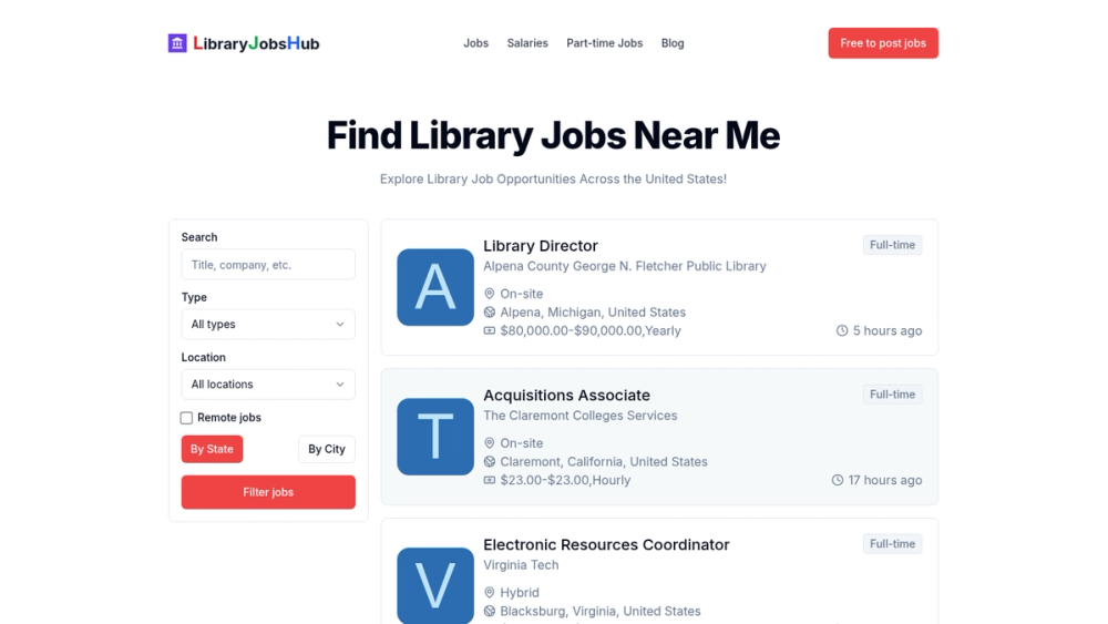 Find the latest library jobs near you, including librarian positions, library assistants, and part-time opportunities.